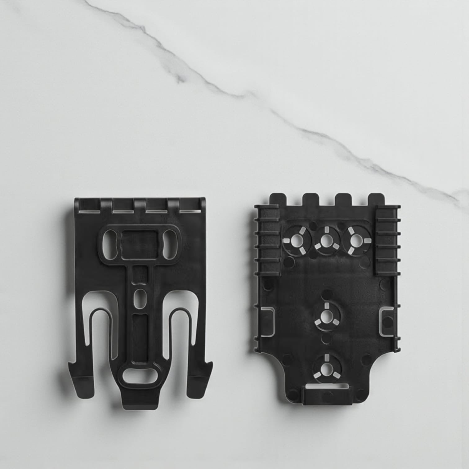 Compatible con la mayoría de fundas que utilizan el patrón estándar de tres agujeros. El kit incluye horquilla de bloqueo y placa receptora, permitiendo una instalación segura, versátil y totalmente modular.
